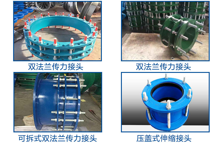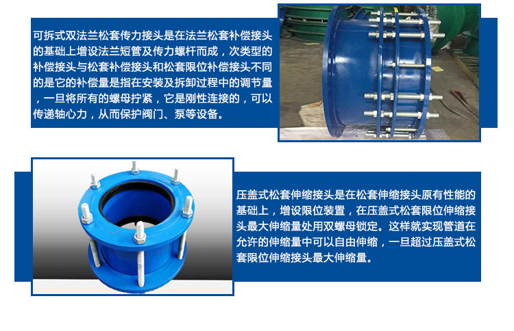 双法兰传力接头:由本体,密封圈,压盖,伸缩短管等主要部件组成。该产品适用于两边均为法兰连接的管道中,安装时调节产品两端的法兰的安装长度,对角均匀拧紧压盖螺栓,使其成为一个整体,并有一定的调节量,方便安装维修时,根据现场尺寸进行调整。在工作时可以反轴向推力传递至整个管道。适用于输送海水、淡水、冷热水、饮用水、生活污水、原油、燃油、润滑油、成品油、空气、煤气、温度不高于250度的蒸汽和颗粒粉状等介质。